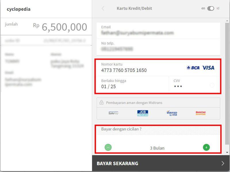 3. Pada halaman pembayaran via midtrans masukan detail kartu kredit Bank BCA Anda, lalu pilih jumlah cicilan yang diinginkan, selanjut nya klik tombol BAYAR SEKARANG