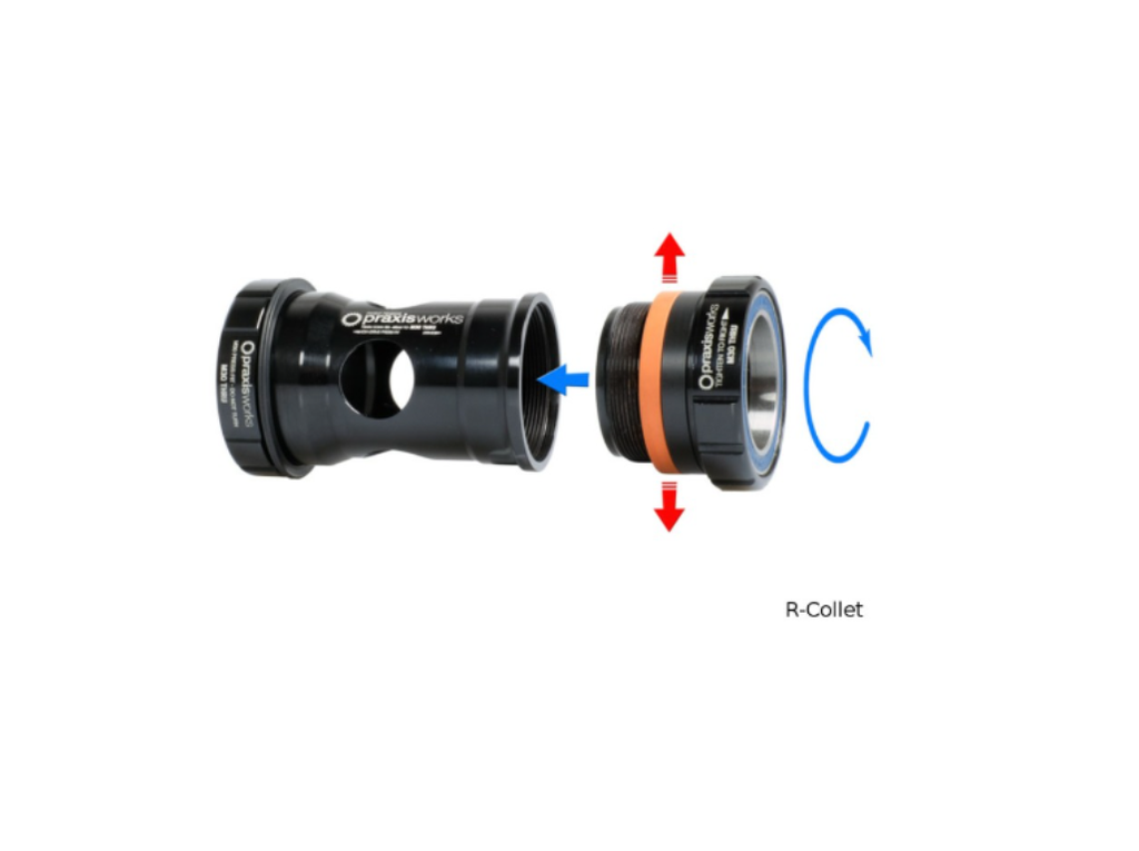 The technology patented by Praxis Works compensates for small tolerances in the frame, thus avoiding annoying pops. When the two shells are twisted together, an elastomer is compressed in a defined way. This elastomer builds up slight pressure on the bearings to seat in the frame free of play.