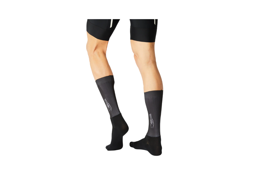 FINGERSCROSSED AERO  is a sock made from a combination of nylon & elastane. The structure of the upper part of the sock ensures maximum aerodynamics. The seamless toe and the elastic fit contribute to a high wearing comfort. Non-slip silicone fabric on cuff. Compression band for more stability at the instep.