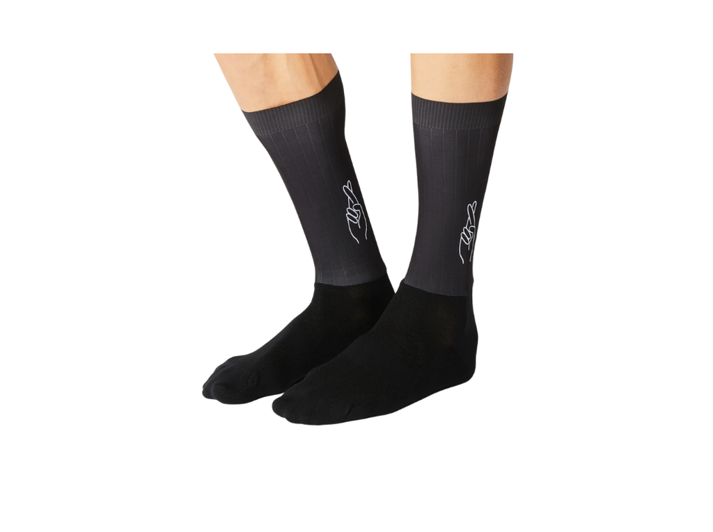 FINGERSCROSSED AERO  is a sock made from a combination of nylon & elastane. The structure of the upper part of the sock ensures maximum aerodynamics. The seamless toe and the elastic fit contribute to a high wearing comfort. Non-slip silicone fabric on cuff. Compression band for more stability at the instep.