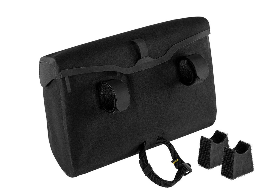 The mini handlebar bag is built from Hexalon, an ultralight laminate designed specifically for Apidura. It attaches via reinforced lightweight velcro straps and optional EVA foam spacers that are designed to work well with drop, flare and flat handlebars.