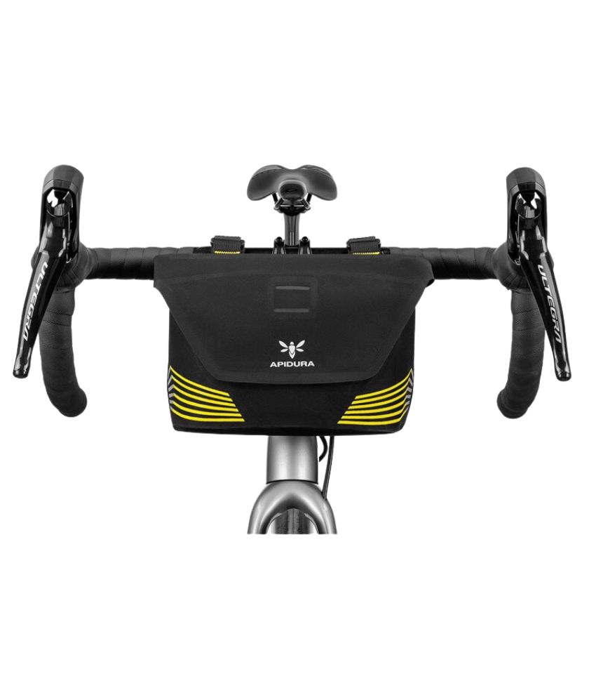 The handlebar bag is built from Hexalon, an ultralight waterproof laminate designed specifically for Apidura. The waterproof fabric and secure opening ensure valuables remain completely dry, no matter the weather or terrain. Accessory attachment points are laser-cut into the fabric, increasing versatility without adding weight and a high-contrast reflective feature is specially designed to enhance visibility in all light conditions.