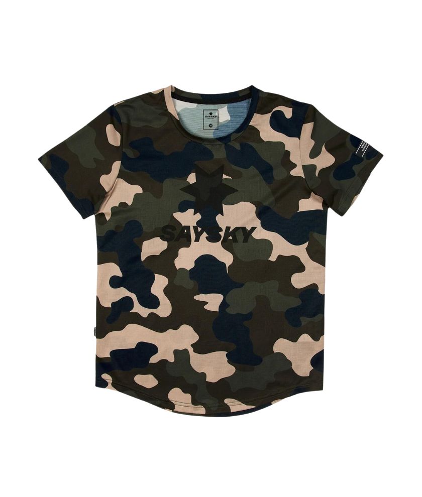 The SAYSKY Camo Combat T-shirt is a short sleeve running t-shirt in a camo print. It's made from recycled polyester and comes with a classic waterprint SAYSKY logo on the front, a woven label on the back, and a WORLDWIDE RUNNING TRIBE label on the arm. The fit is regular with a soft fabric feel and high level of breathability.