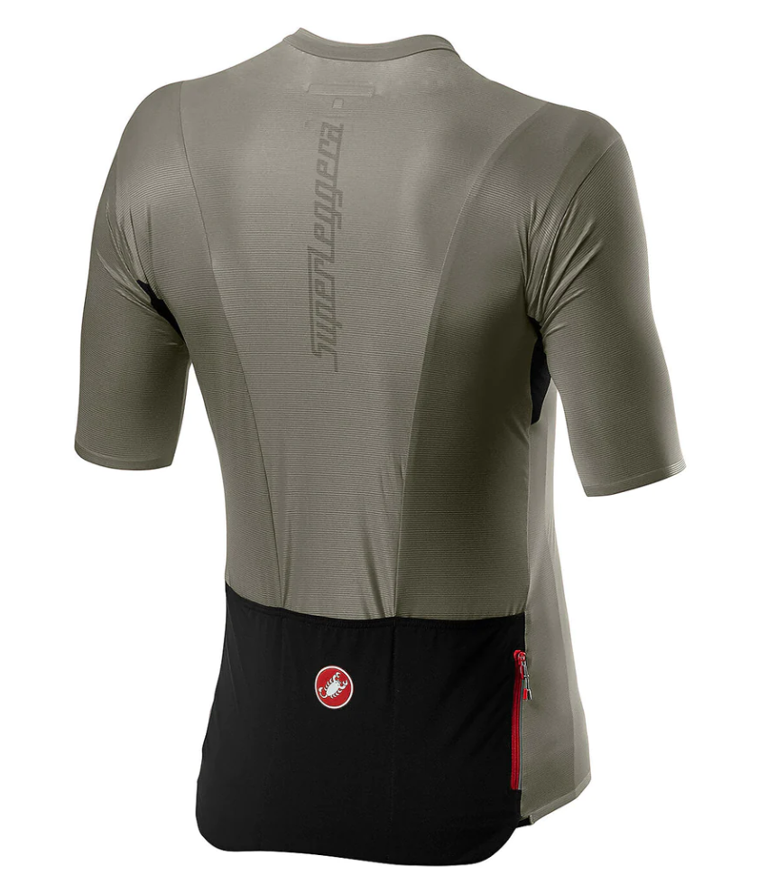 This is the jersey that brings Castelli's fabric and construction engineering together in one of the most refined jerseys we've ever made. The goal with this jersey was to make it as light as possible without sacrificing transparency, sun protection and convenient features like a zippered key pocket. We've brought in a new fabric that we call Oltre, which roughly translates to beyond, and it really goes beyond what you normally find in a jersey, with the horizontal stripes giving great breathability and stretch while providing good support for the pockets.