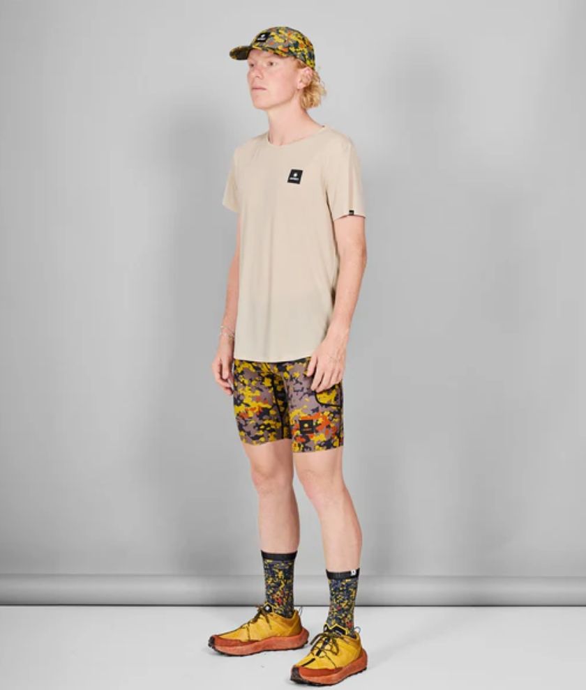 SAYSKY's Clean Flow T-Shirt is for runners who want the best. Designed with a race fit, it features a beige body with a black box logo on the front chest and a hand-drawn illustration on the back. This shirt is made from incredibly lightweight Flow material, which offers high flexibility and a soft feel.