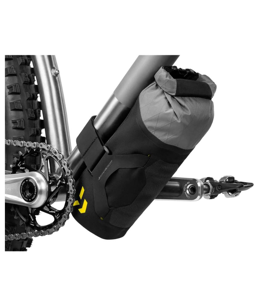 The downtube bag securely fastens to the downtube and similar diameter tubes to provide a versatile and compressible storage space for spares and long-distance essentials. It has enough capacity for a 1L water bottle, allowing it to be used as a bottle holder bag for bikes with limited bottle storage space within the main triangle.