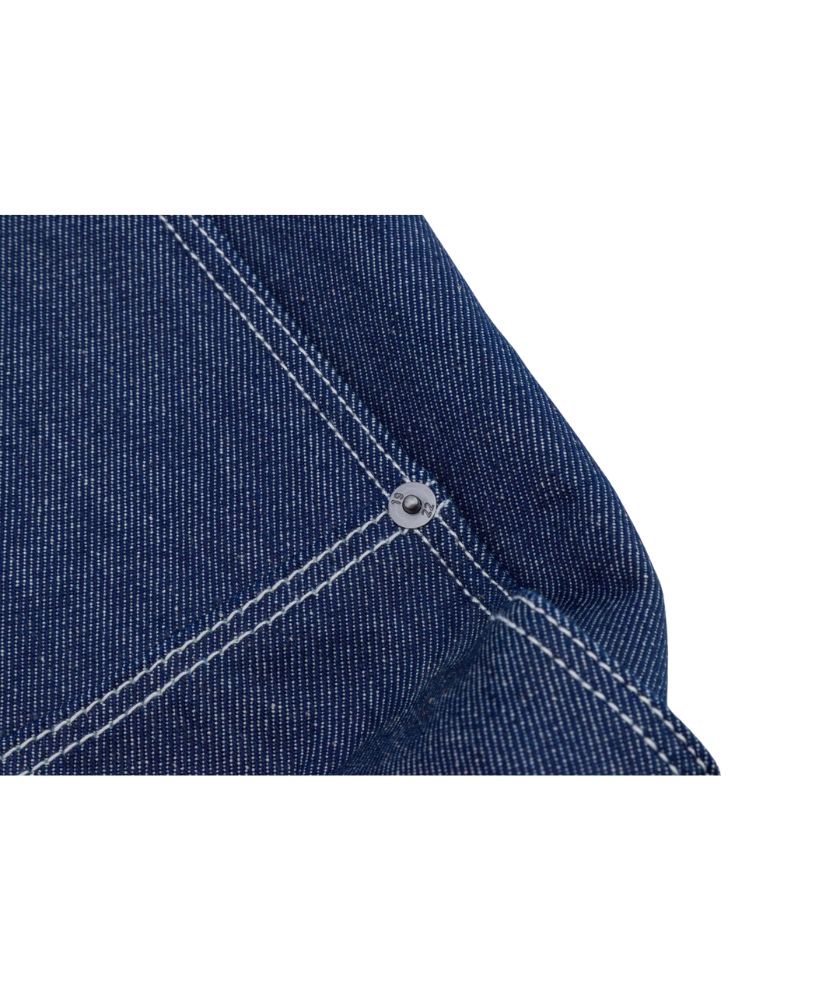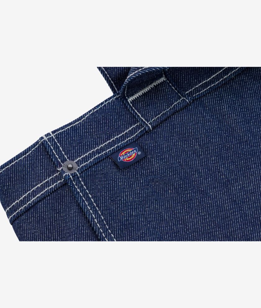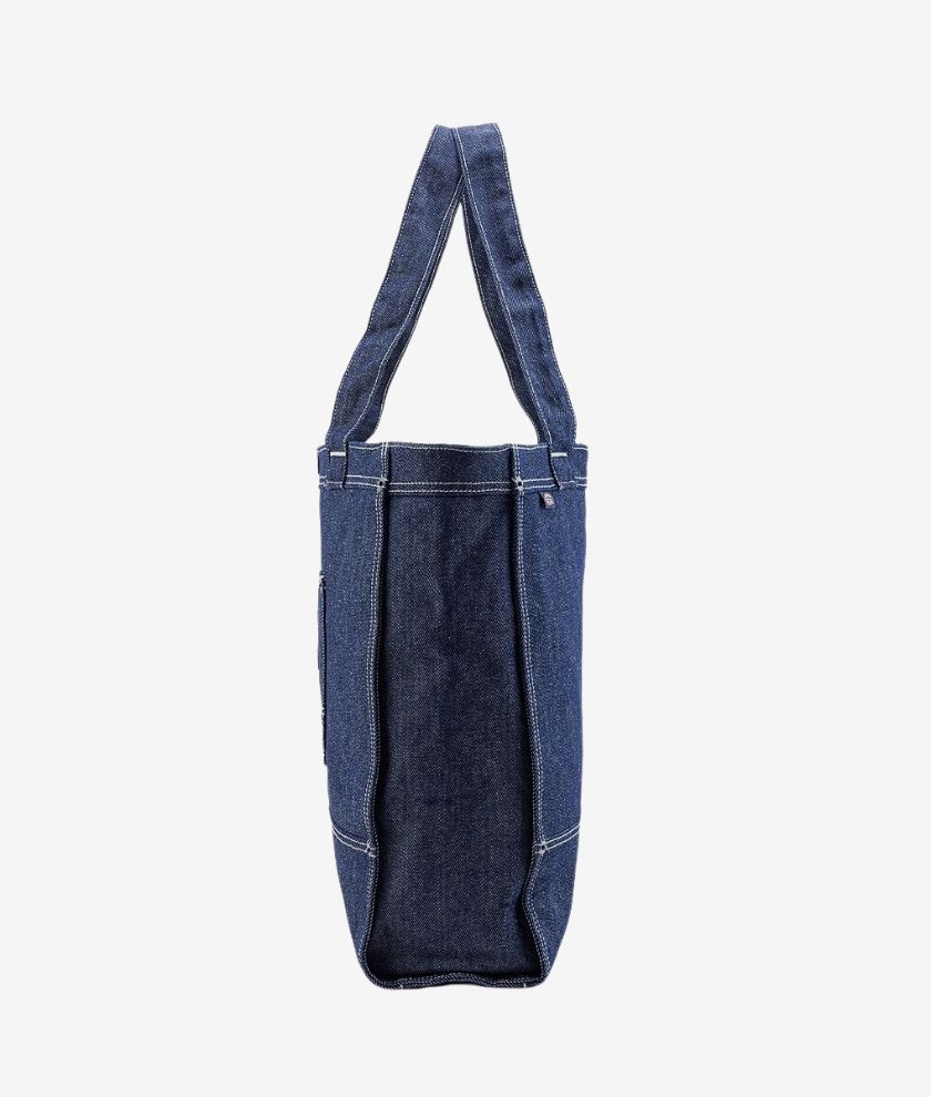 A workwear-inspired tote bag made from 100% cotton. The bag is made from thick denim with vertical service pinstripes, metal studs and a metal snap closure. There is an external pocket for extra storage and the bag features the signature Dickies woven label.