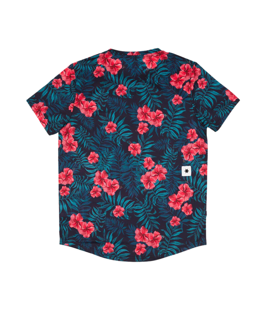 SAYSKY's Flower Combat T-shirt is a men's T-shirt designed for regular fit. The base body color is white, and the front chest is switched with blooming hibiscus print fabric. A white SAYSKY logo is printed on the front chest, and a logo patch is attached to the back side. It has excellent moisture absorption and quick drying properties, ensuring high breathability and keeping you comfortable. It's made from lightweight recycled polyester that's soft to the touch and highly breathable.