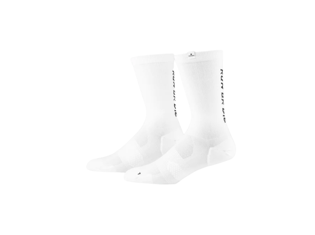 The SAYSKY Run Or Die Socks are highly functional and carefully created for optimal performance on the run. They come with a tight fit and minimal cushion to get your feet as close as possible to the shoes, to enhance your overall running experience. These are high calf socks in white with a 'RUN OR DIE' print.