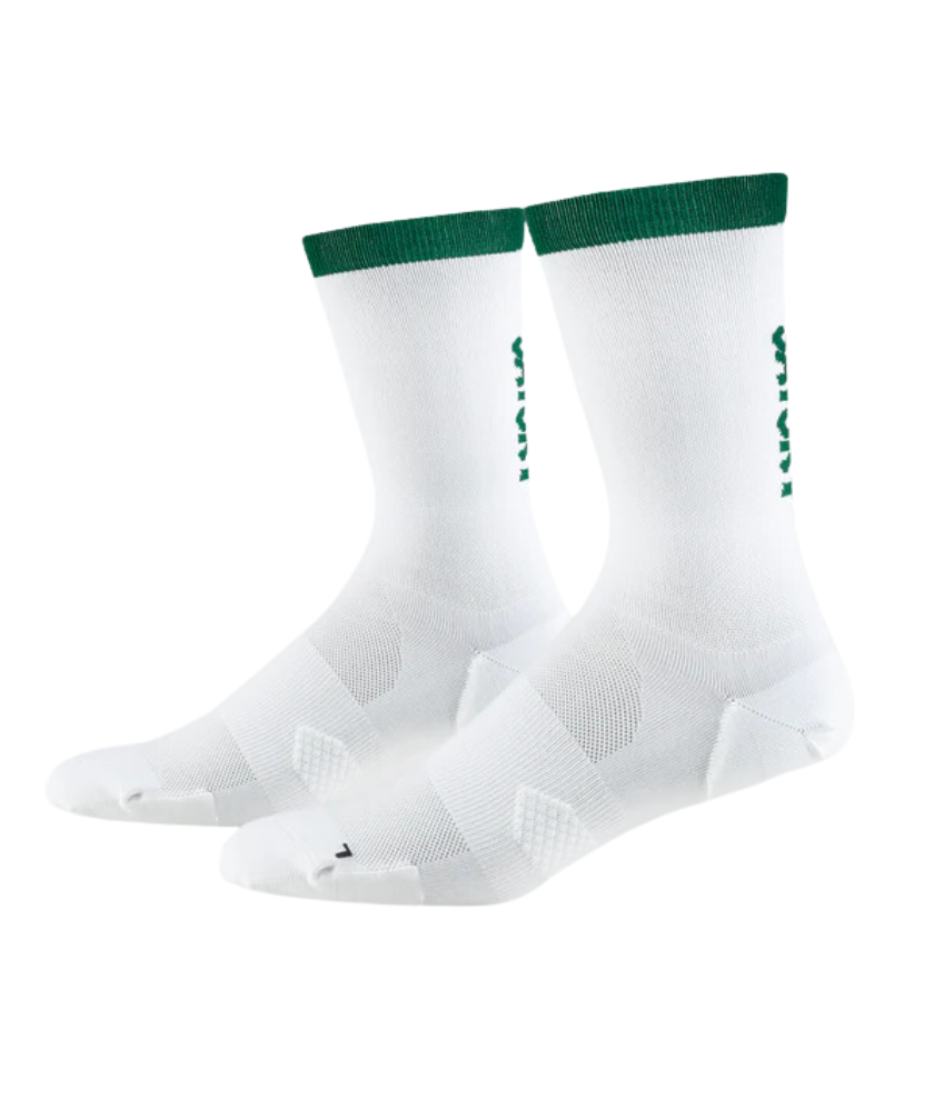 SAYSK's high combat socks are socks made with high functionality and commitment to achieve optimal performance in running. The tight fit and minimal cushioning keep the foot as close to the shoe as possible to improve overall running performance. Dark green SAYSKY logo is designed on white high calf socks.