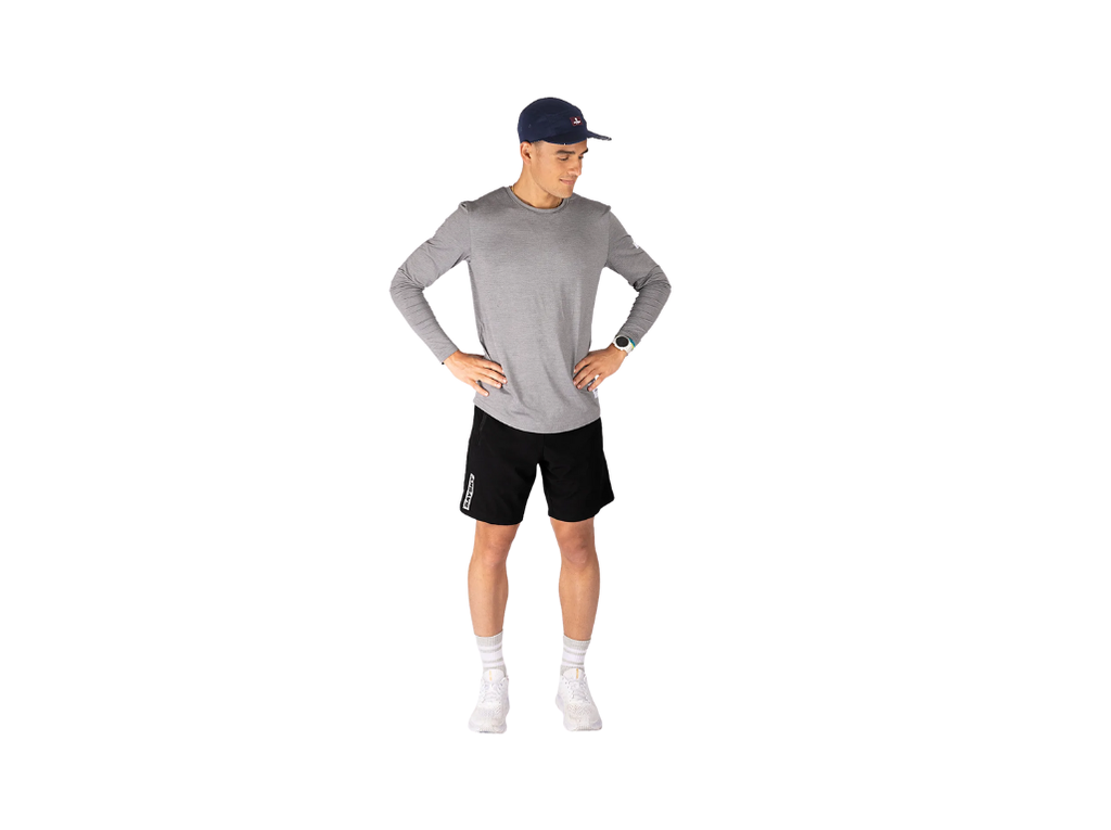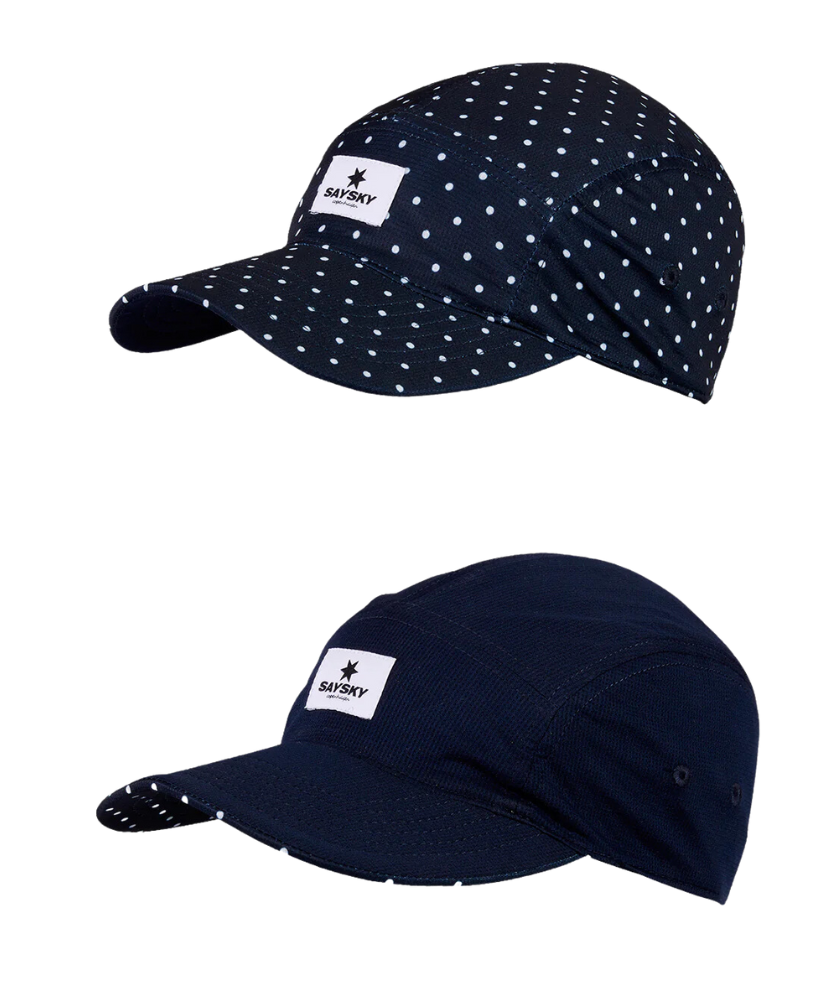 The SAYSKY Reverse Cap is a reversible 5-panel cap made for running. It is made from recycled polyester. One side has a blue polkadot print and the other side is blue.