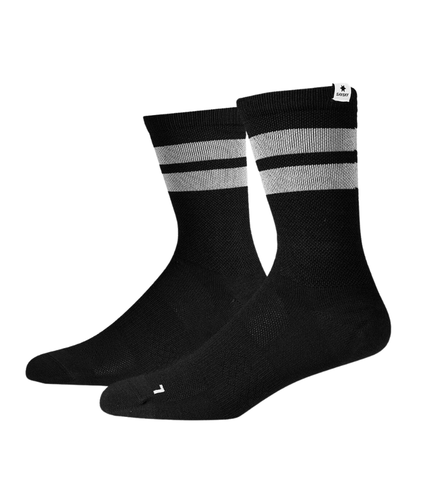 The SAYSKY High Merino Socks are running socks made in a technical blend with 30% merino wool. They are perfect for winter running because of the merino wool mix, which makes them warmer than our other socks. Due to merino wools abilities these socks are highly breathable, and will keep your feet dry and comfortable while running. They come in black with reflective stripes.