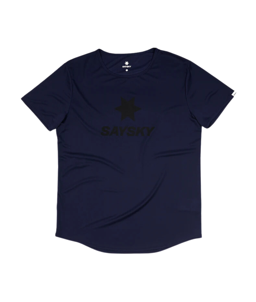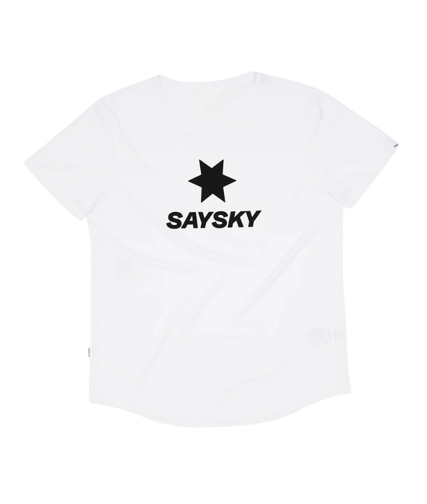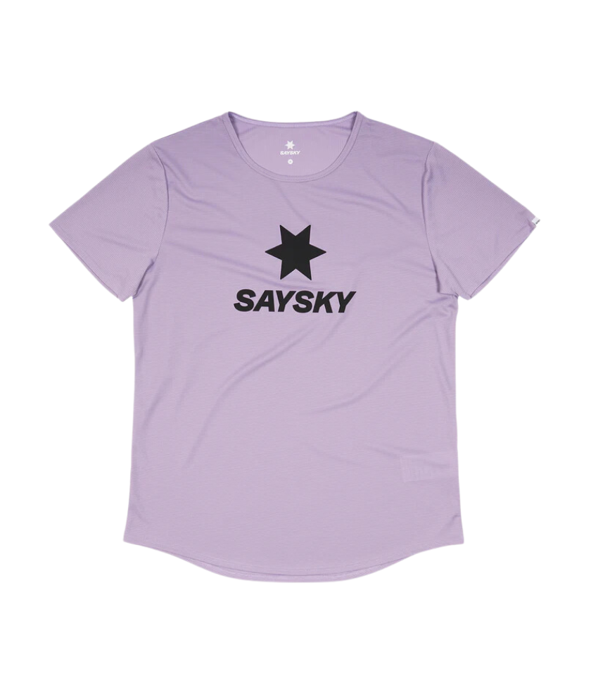 The SAYSKY Logo FLOW Tee is designed for runners and athletes who demand the best. It has a simple design with a purple colored body and a race fit, and the classic SAYSKY logo is printed in black on the front. A white SAYSKY label is woven into the backside. The main material is 79% recycled polyester, which is soft to the touch and highly flexible without clinging to the skin, making it highly functional and ultra-lightweight.