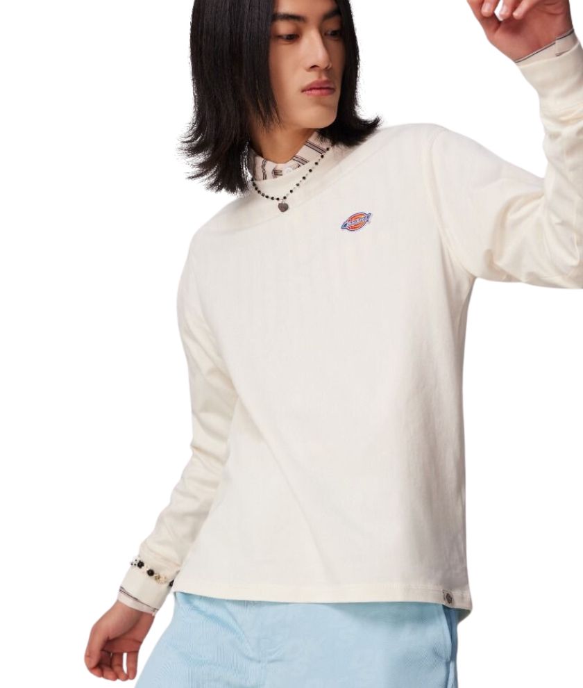 A long-sleeved T-shirt with a smooth texture and comfortable fit. The chest features an embroidered brand logo patch. The flat seam stitching gives a clean impression. The cuffs are ribbed and can be pushed up for a casual look.