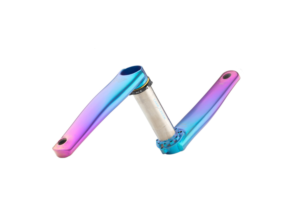 We are proud to announce that our renowned eeWings titanium crankset is now available in a unique tie-dye finish. eeWings Tie-Dye are made from the same high-grade titanium as the standard eeWings cranks and are hand-finished in a striking blue to purple tie-dye color giving each crank a unique character. This process ensures that each crank will be one-of-a-kind with no two cranks carrying the exact same pattern or finish.