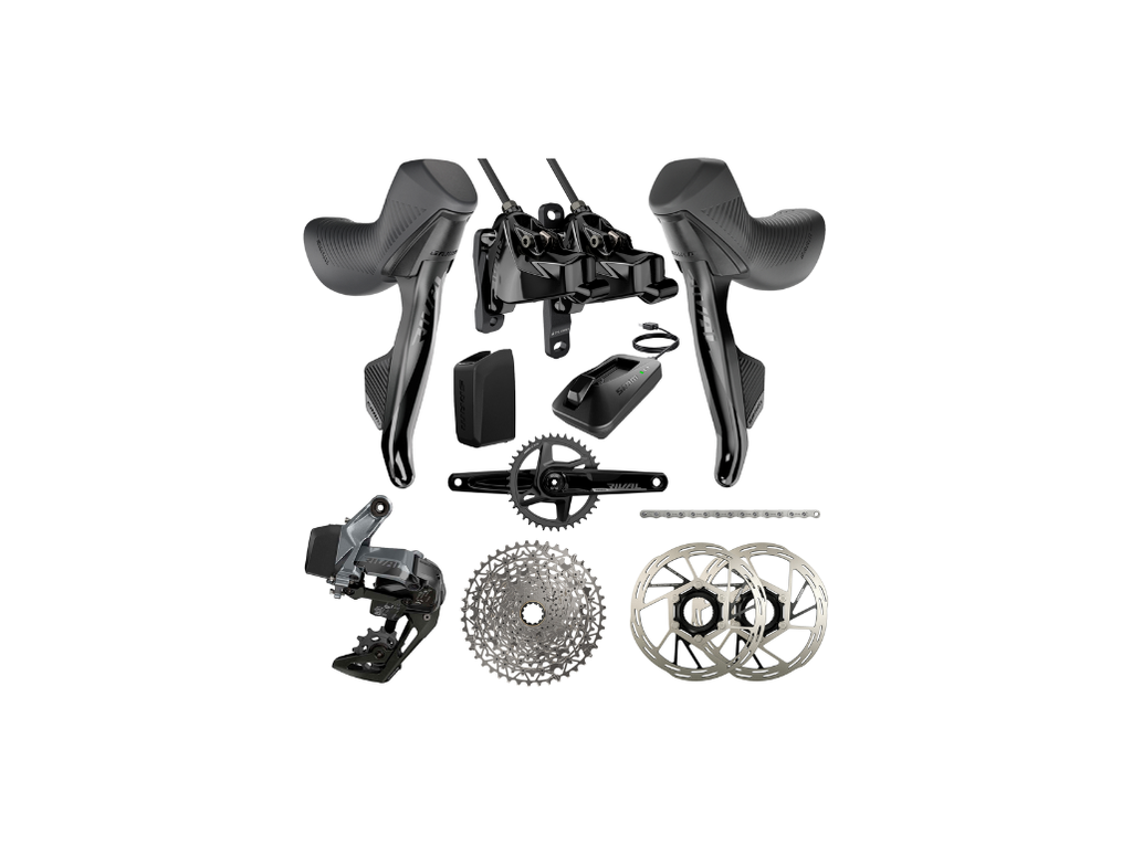 Sram: SRAM Rival XPLR AXS DUB Groupset - 165/170/172.5/175mm Includes: Shift/Hyd Disc Brake, RearDer & battery, 2x 160mm Paceline Centerlock Rotor, Crankset DUB 165 to 175 40T, Rival D1 Chain, Cassette XG-1251 10-44T, Charger/Cord