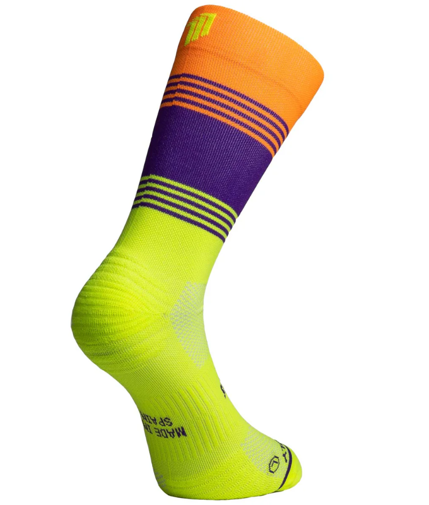 Running socks with greater support in the ankle and metatarsal areas. They offer a medium level of compression that helps blood circulation and reduces inflammation in longer runs. The heel and toe are made of COOLMAX® terry cloth to minimize impact, creating a greater sensation of comfort and breathability. They prevent and avoid the appearance of blisters.