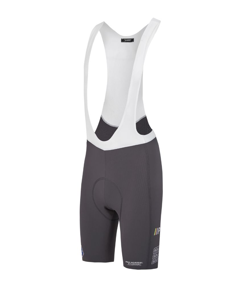 The new Solitude Logo Bibs are constructed from proprietary fabric developed for Pas Normal Studios. The bibs feature unique functional 3D pathways to create air channels to transport heat away from your body effectively. These channels cover the entire area from the hems to the back panel of the bibs, allowing air to circulate easily between your skin and the fabric. The Solitude bibs also provide breathability with the exposed polyester yarn on the inside of the bib shorts. The Solitude Bibs are updated with a new, taller striped silicone in the leg opening to distribute the grip better.