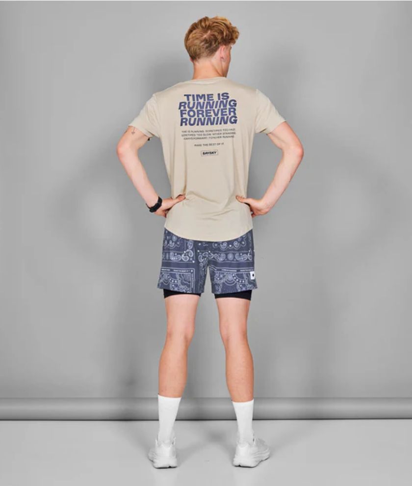 SAYSKY's Statement PACE T-shirt is a short-sleeve running T-shirt for men. It features a SAYSKY logo patch on the front chest and a large statement print on the back. This top is perfect for those looking for a slightly thicker material that is also very soft and sweat-wicking.