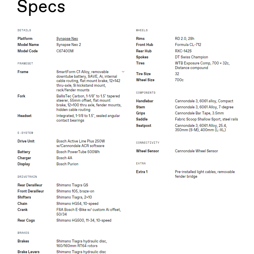 Specifications for Synapse Neo 2 E-Bike