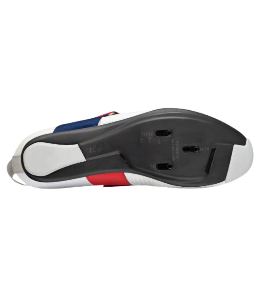 At the base, the R2 outsole’s engineered carbon-fiber layup saves weight and delivers increased stiffness, with a stiffness index rating of 10, making this outsole the most responsive in the fizik range. A wide vent inlet and deep internal channeling provide cooling airflow to aid in temperature regulation. The cleat positioning is set slightly further back compared to traditional settings to optimize pedaling efficiency and reduce knee compression—especially well-suited for very aggressive, forward aero positions typically adopted by triathletes.