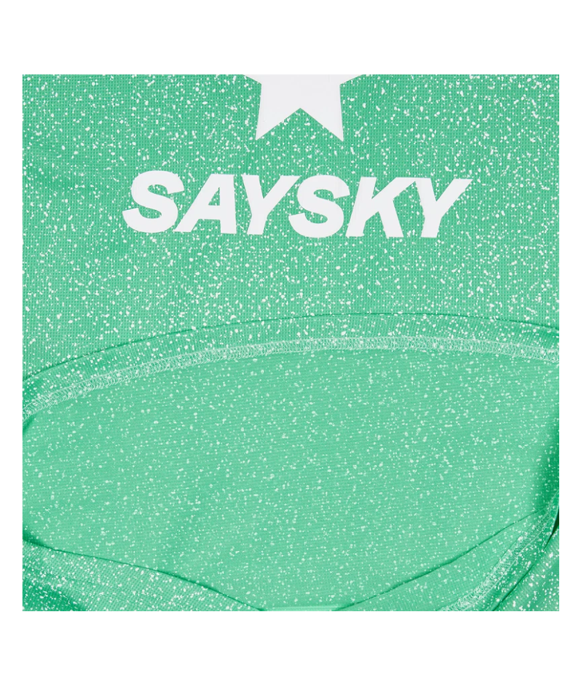 SAYSKY's Universe Combat T-shirt is a short sleeve running T-shirt with a mint green body and an all-over Universe print. Made of 68% recycled polyester made in Japan, it has excellent moisture absorption and quick drying properties, ensuring high breathability and comfort. Made from lightweight recycled polyester material that is soft to the touch and highly breathable. The front chest features the classic SAYSKY logo in white, with a white logo patch on the backside.