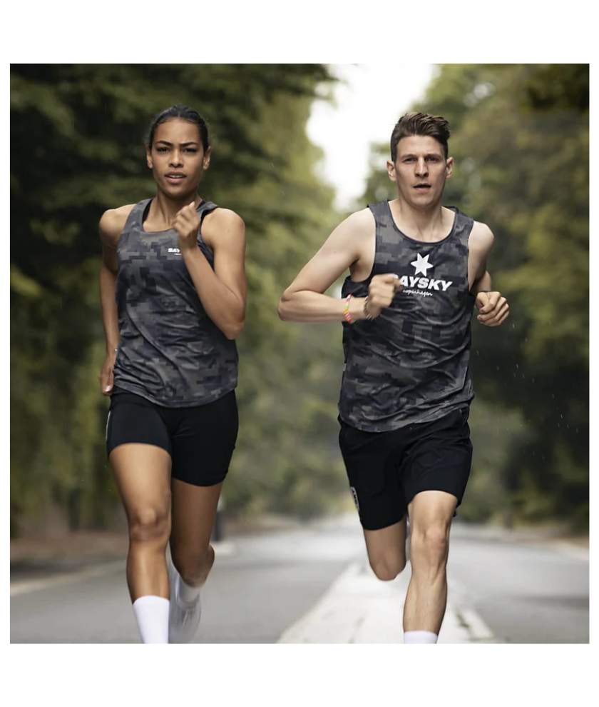 The SAYSKY Women's Camo Combat Singlet is a racing singlet designed with a green pixel camouflage print. The front chest has a classic white SAYSKY logo, and the back has a SAYSKY logo patch. The slim-fit design and ultralight, breathable fabric make this singlet perfect for racing runs.