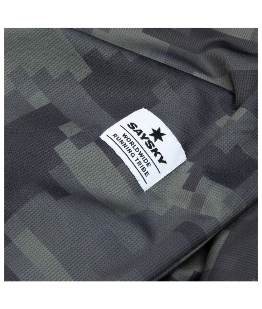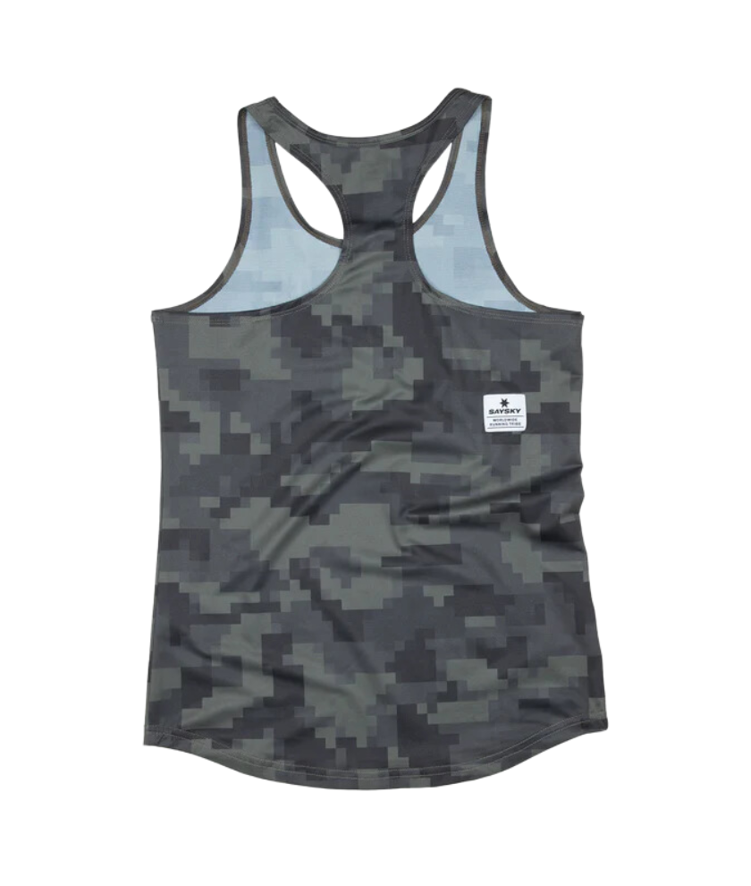 The SAYSKY Women's Camo Combat Singlet is a racing singlet designed with a green pixel camouflage print. The front chest has a classic white SAYSKY logo, and the back has a SAYSKY logo patch. The slim-fit design and ultralight, breathable fabric make this singlet perfect for racing runs.