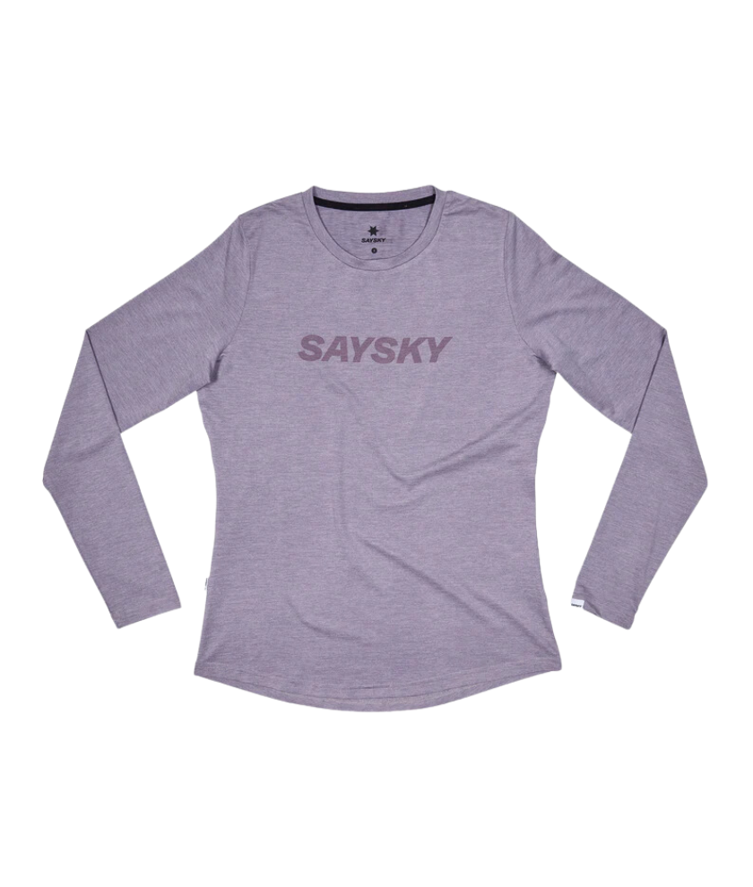 SAYSKY's Women's Logo Pace Long Sleeve is a women's long sleeve T-shirt for running. Made of recycled polyester in a bright yellow color, it features a tonal SAYSKY logo on the front chest and a white SAYSKY logo patch on the back. The regular fit design is designed to provide both comfort and high performance.