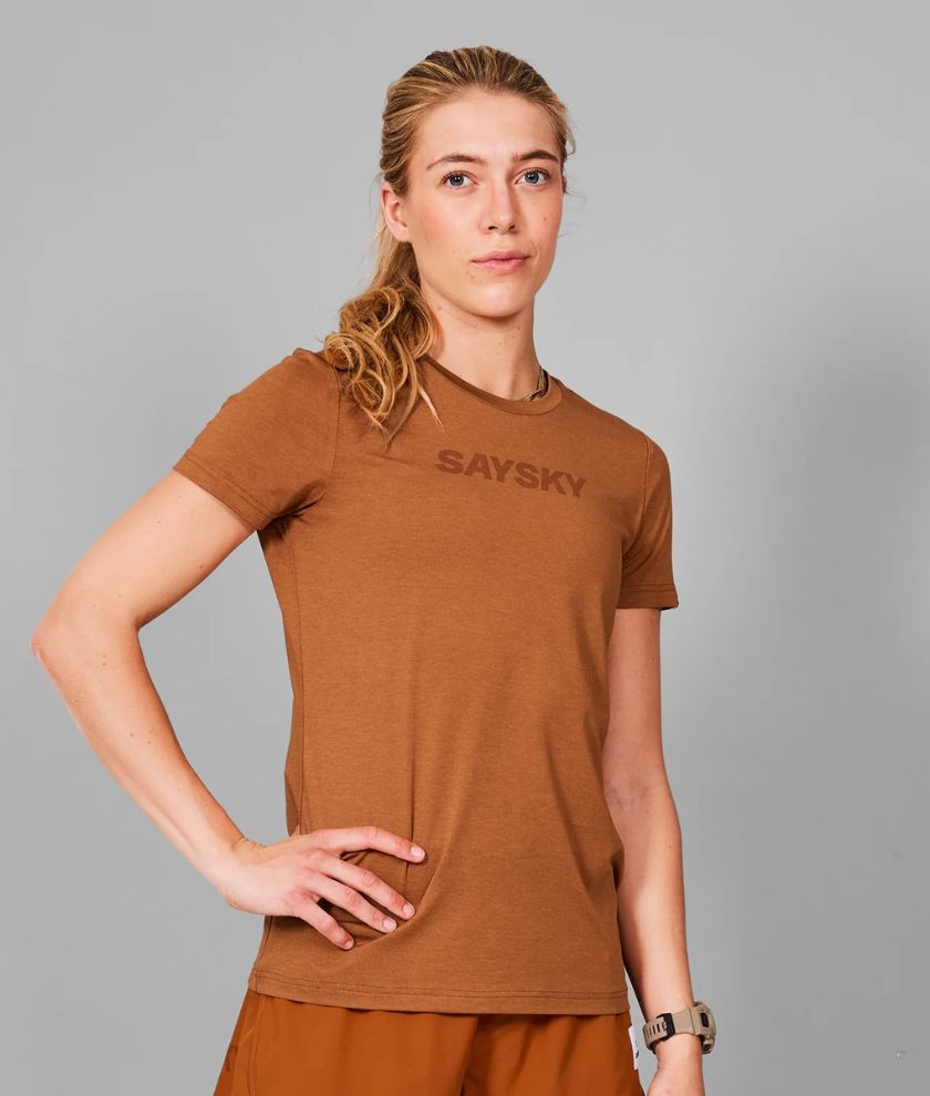 The SAYSKY Logo Pace T-shirt is a short sleeve running t-shirt for women. It comes with a logo on the chest and a woven SAYSKY label on the back. Our pace fabric is ideal if you're looking for a slightly heavier, yet super soft fabric with great wicking abilities.