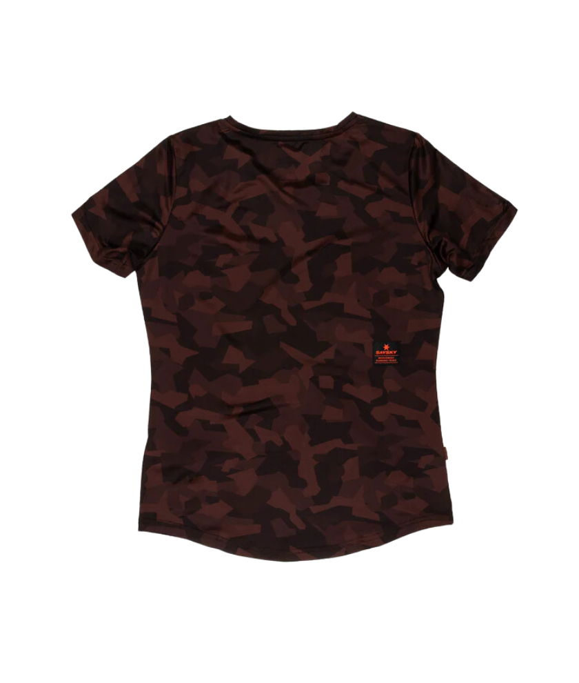 The SAYSKY Women's Splinter Combat T-shirt is a short sleeve running t-shirt in a burgundy splinter camo print. It's made from a super lightweight fabric and comes with a SAYSKY logo on the front and the back, and a WORLDWIDE RUNNING TRIBE logo on the arm. The fit is regular with a soft fabric feel and high level of breathability.