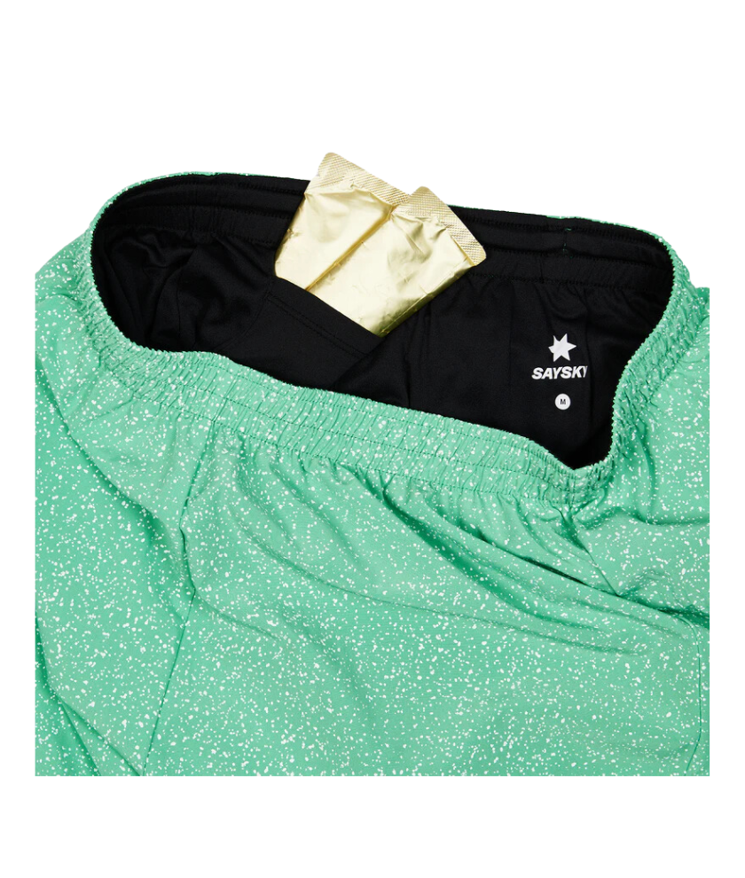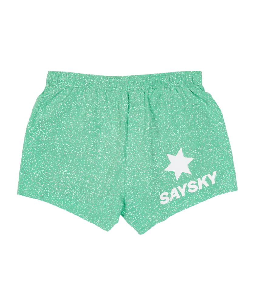 SAYSKY Women's UNIVERSE Pace Shorts 3 inches are classic running shorts for women with a short inner. It features an all-over Minty Universe print and a white SAYSKY logo patch on the front hem. The back features the classic white SAYSKY logo. Lightweight, highly breathable, and has a regular fit for high performance. Suitable for running as well as for use at the gym.