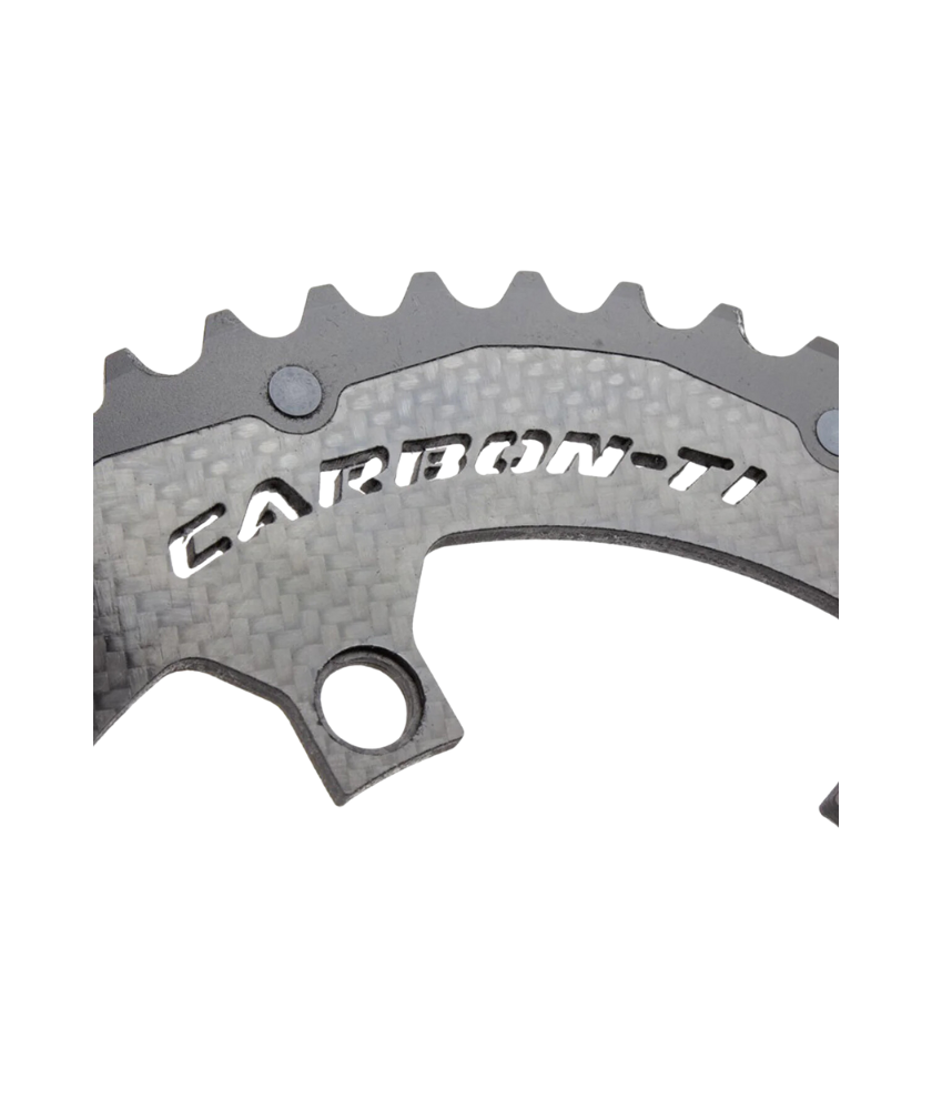 Carbon-Ti chainring X-CarboRing 50 x 110 DA9100 (4 arms), crown in Al7075-T6 aluminum alloy, structural carbon fiber with polished 3K finish and Grade 5 Titanium pin. 50 teeth external gear and bolt round (BCD ) 110 mm 4 arms. Compatibility with Shimano Dura Ace FC-9100, Ultegra FC-8000 or SRM Origin 9100 cranks and Shimano, SRAM and Campagnolo 10-11 speed groupsets.