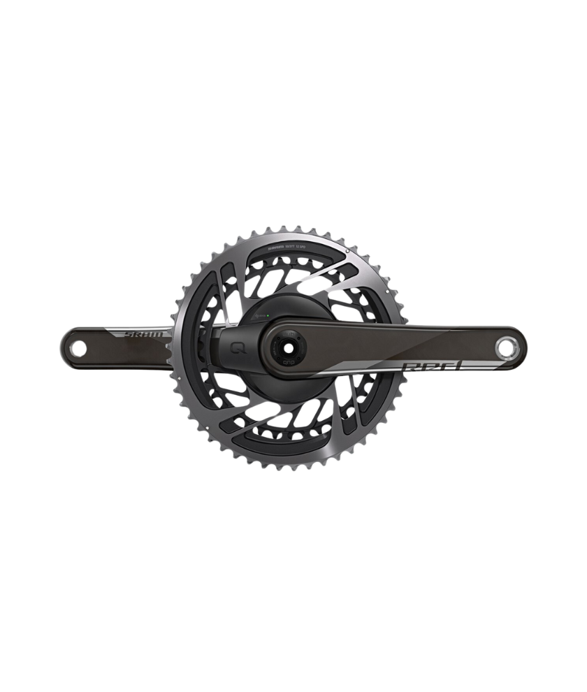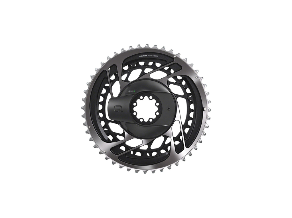 This is the Sram Red AXS™ Power Meter Crankset. This crankset uses X-Range™ gearing technology to give you better, more useful gearing. Sram designed all of the chainring pairs to have a 13-tooth gap to help keep the shifting precise, no matter what chainring size and cassette you are using. Also, the bigger range of gears on the Sram Red AXS cassette allow for smaller chainring sizes without losing any top-end gears. The Quarq DZero power meter is fully integrated into the chainring set to reduce weight. The DZero power meter reading is accurate within +/-1.5% and measures the left and right leg separately.