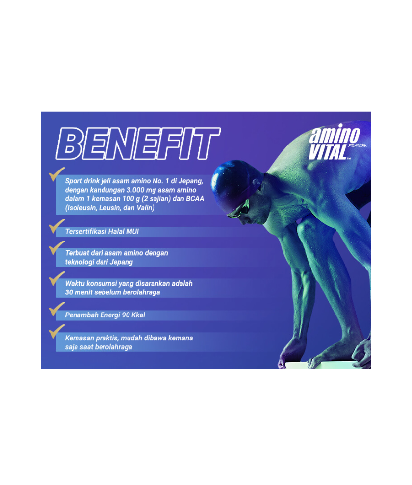 aminoVITAL™️ is an apple-flavored amino acid jelly drink, known as the number one Sport Drink in Japan. Each 100g package (2 servings) contains 3,000mg of amino acids and 1,640mg of BCAAs (Leucine, Isoleucine, Valine), and it is certified as halal for athletes and sports enthusiasts.