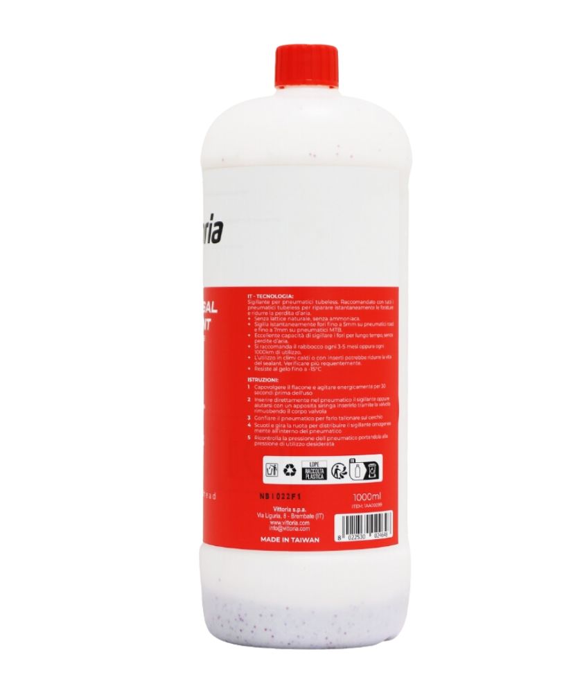 Vittoria's Universal Tubeless Tire Sealant takes a fresh approach to serving the needs of riders, no matter which type of bike they ride. The secret is in the liquid base, which is thin enough to find and seal even the smallest punctures quickly and effectively. Suspended within that base are platelets, which clog together to seal larger punctures, providing the user with protection against a range of puncture sizes, and on any type of bike. In testing, Vittoria’s new Universal Tubeless Tire Sealant sealed punctures up to 7 mm instantly, and provided excellent air retention up to 1200km. The formula is ammonia free, which prevents the sealant from damaging the tire, and makes it suitable for use in combination with tire inserts such as the Vittoria Air-Liner.