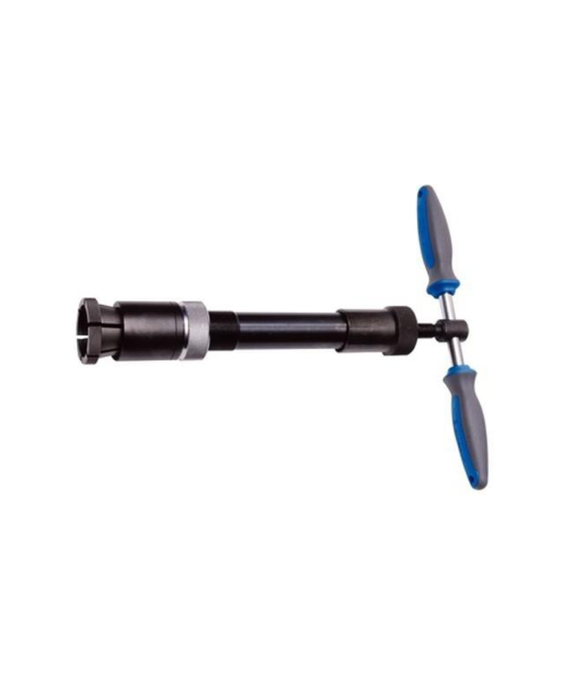 The puller is a tool for quickly and precisely removing the headset crown race from 1", 1.1/8", 1.1/2" suspension or rigid front fork. To use, place the puller bush onto the front fork race and fix it by turning the nut. Turn the spindle attached to the steering column to pull the crown race from the fork. The product enables efficient race removal without the use of a hammer. It is intended for both professionals and home users.