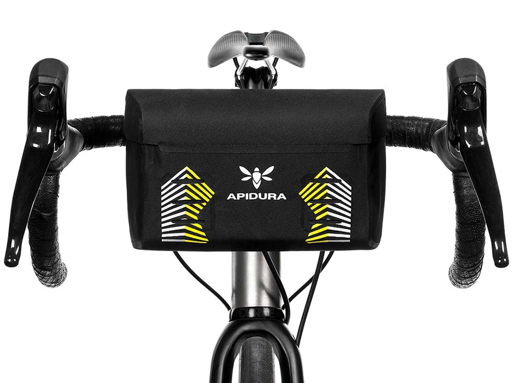 The mini handlebar bag is built from Hexalon, an ultralight laminate designed specifically for Apidura. It attaches via reinforced lightweight velcro straps and optional EVA foam spacers that are designed to work well with drop, flare and flat handlebars.