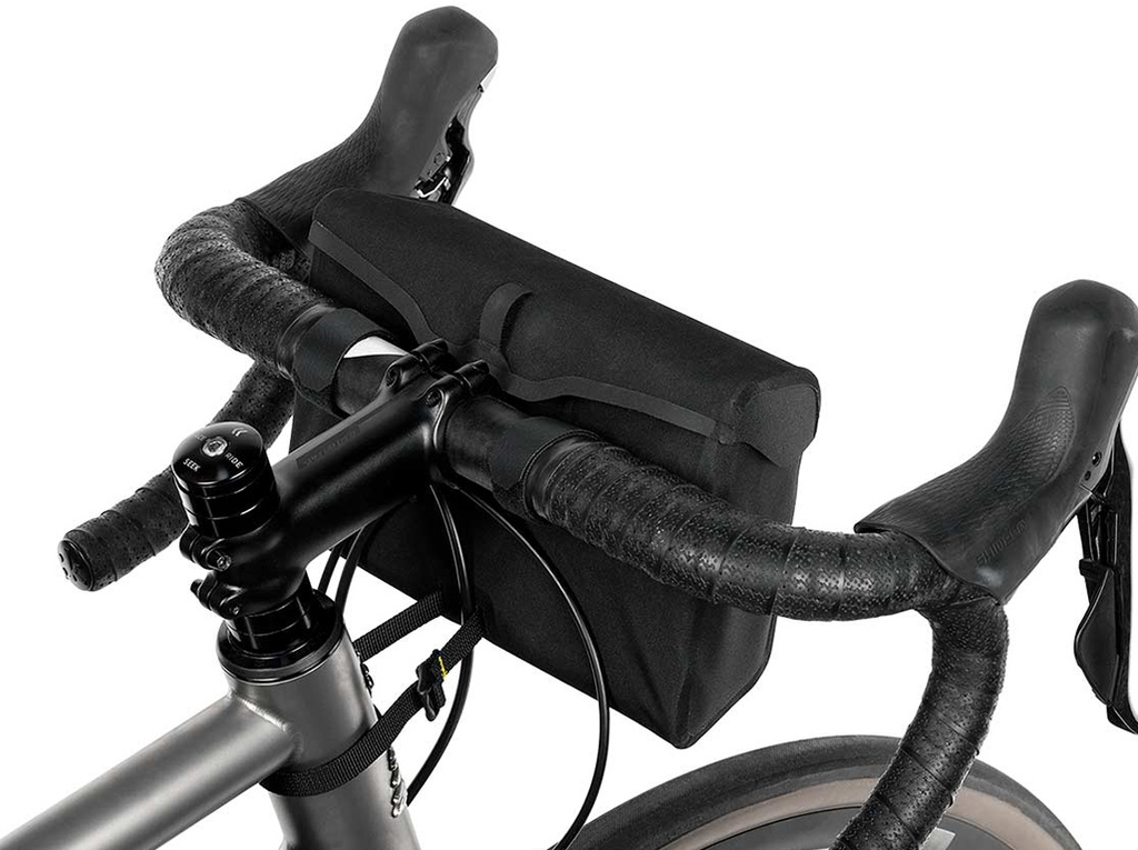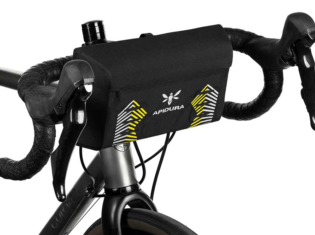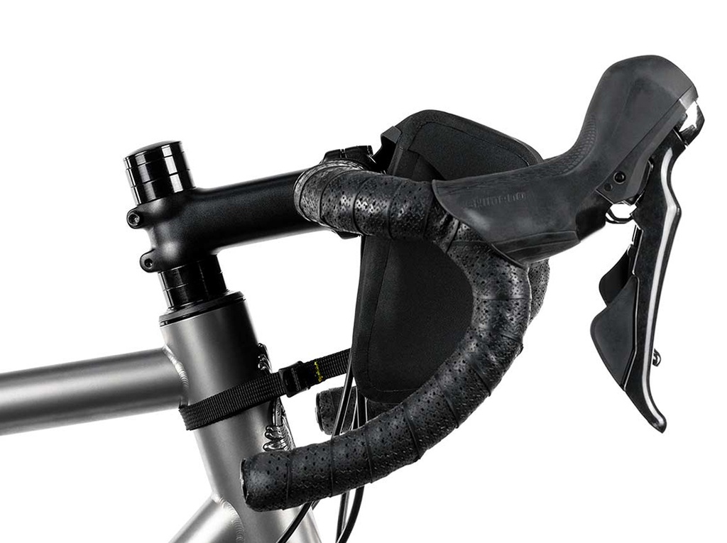 The mini handlebar bag is built from Hexalon, an ultralight laminate designed specifically for Apidura. It attaches via reinforced lightweight velcro straps and optional EVA foam spacers that are designed to work well with drop, flare and flat handlebars.