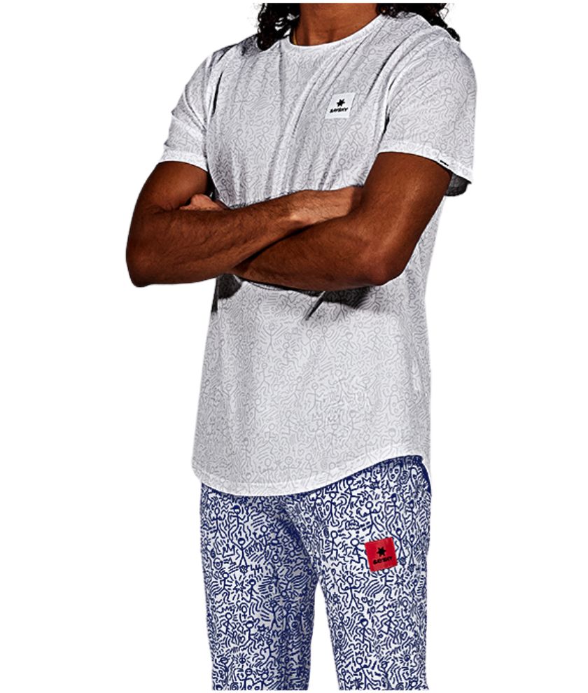 The SAYSKY Contemporary Cartoons Combat T-shirt is a men's short sleeve running t-shirt in dark blue with an all over hand drawn stick figure animation print as well as a big print on the back and a woven SAYSKY logo on the front. The T-shirt is moisture-wicking and quick-drying, which ensures high breathability and increased airflow. The technical construction reduces the fabric’s ability to cling to your skin.