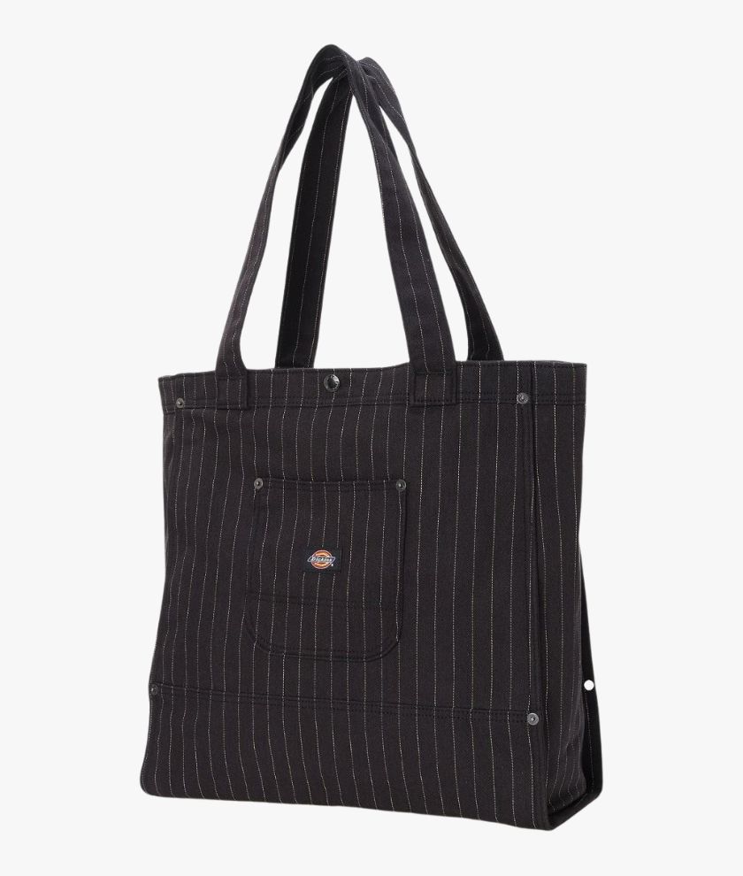 A workwear-inspired tote bag made from 100% cotton. The bag is made from thick denim with vertical service pinstripes, metal studs and a metal snap closure. There is an external pocket for extra storage and the bag features the signature Dickies woven label.