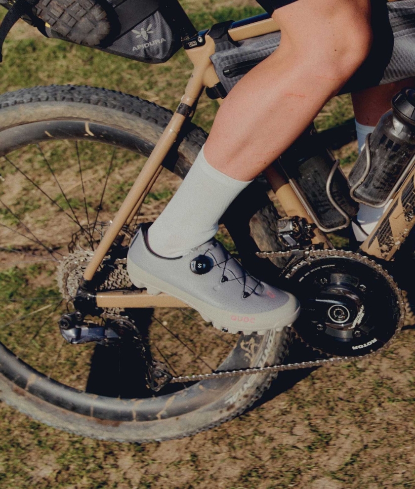 Adapted for micro-accurate precision adjustment, the intuitive dial system features a one-click quick release, making it easy to get on and off in dynamic ride scenarios. A stiffer, Nylon-composite midsole delivers performance and race-readiness to the shoe while remaining airy and lightweight. In the outsole, QUOC's custom-specced GravelGrip™ rubber is adapted for excellent grip and walkability, whether you're competing in multi-day, ultra-distance races, or embarking on a leisurely hike-a-bike tour.