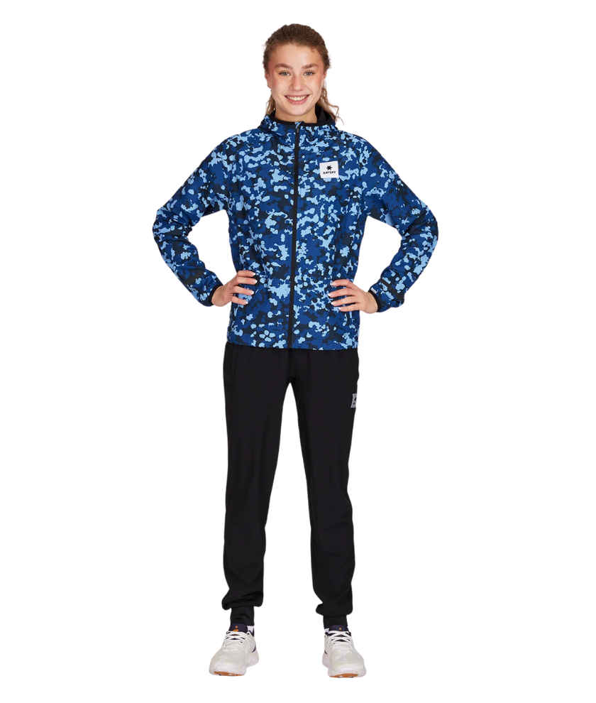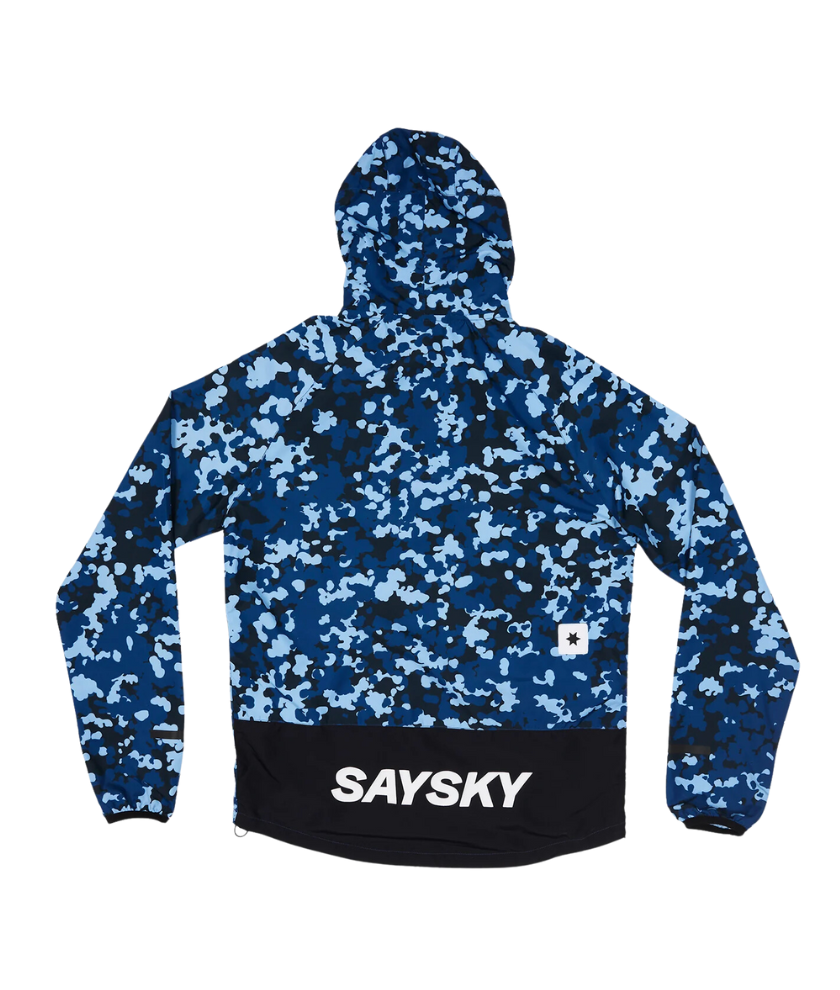 The SAYSKY Camo Pace Jacket is a men's running jacket designed to withstand the wind. The jacket comes with a blue flecktarn print with SAYSKY logos on the chest and the back. The fabric is lightweight to provide a comfortable fit and ensure high breathability for the body. This version comes without thumbholes