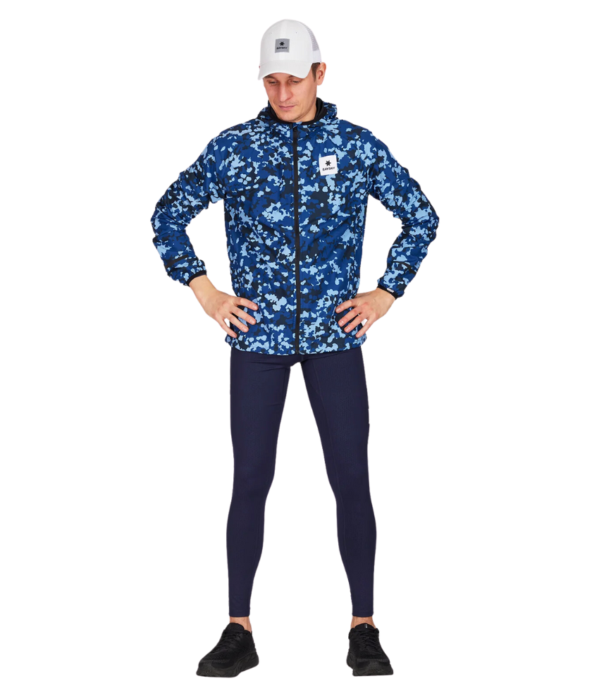 The SAYSKY Camo Pace Jacket is a men's running jacket designed to withstand the wind. The jacket comes with a blue flecktarn print with SAYSKY logos on the chest and the back. The fabric is lightweight to provide a comfortable fit and ensure high breathability for the body. This version comes without thumbholes