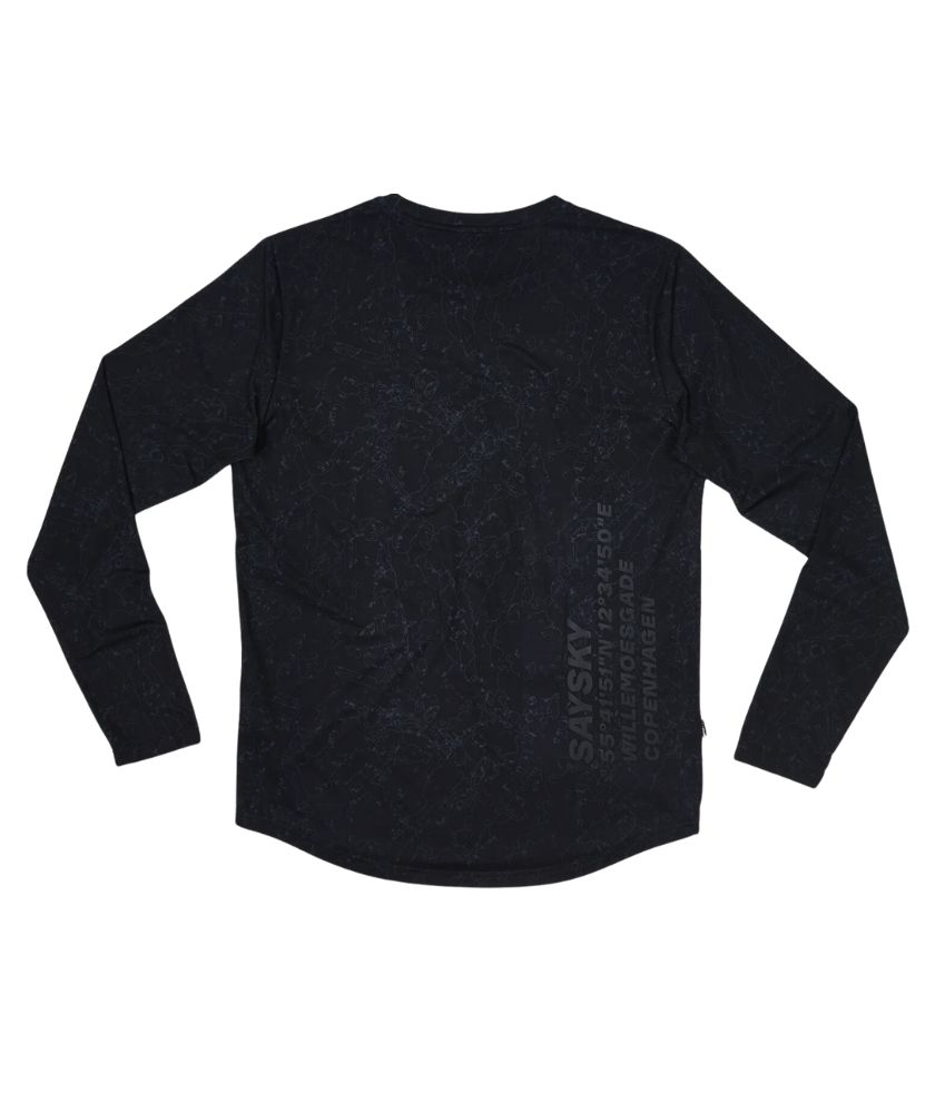 The SAYSKY Map Blaze Long Sleeve is a men's running t-shirt with the Copenhagen Origins all-over print. It comes with black SAYSKY logos on the front and back right hip. The fit is regular and designed to provide you with comfort and a high level of performance on the run. The shirt comes with a reflective print on the back.