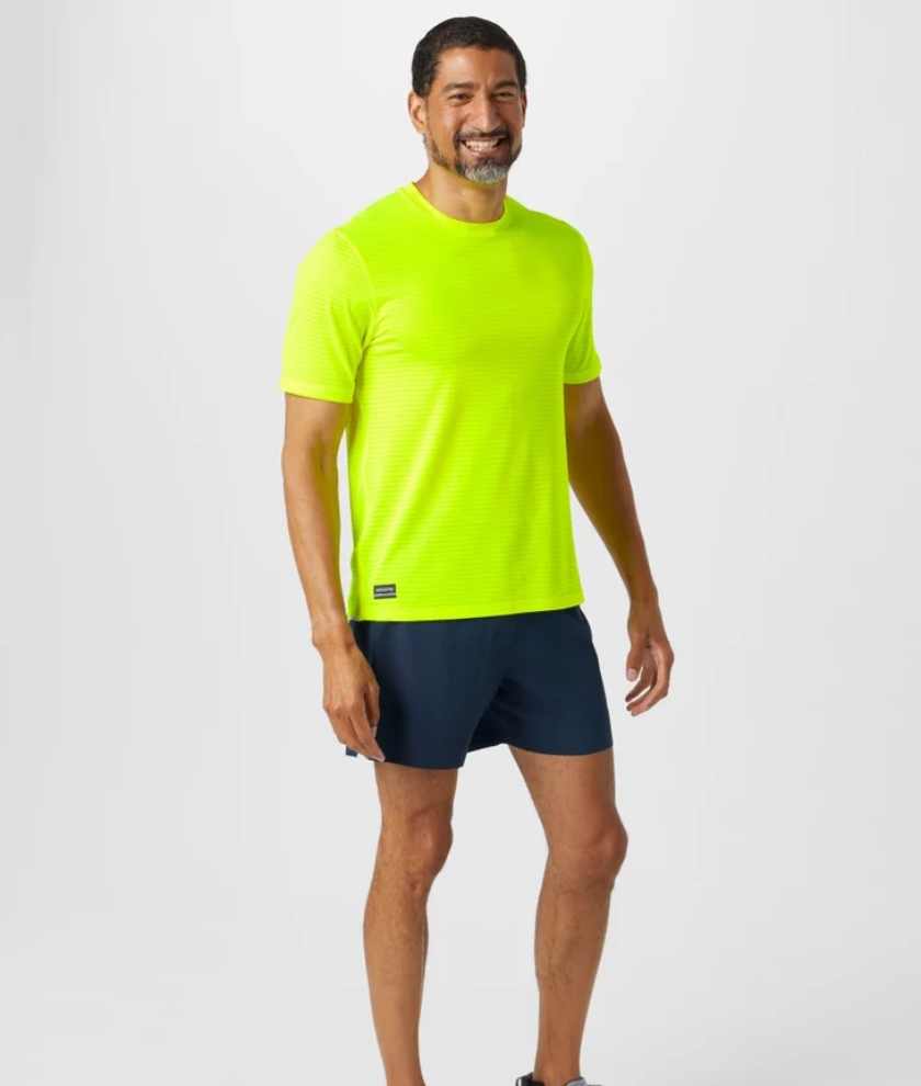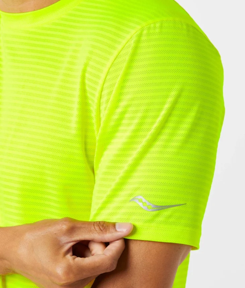 When training calls for a fast-paced day the Saucony Men's Kinvara Short Sleeve will be there to provide for all your speed needs. Made with polyester mesh fabric that is incredibly lightweight and breathable you're comfortable from the first step until the finish. This top dries fast and won't cling to your sweat as you train in the summer sun. Small details in the seaming such as backward rolled shoulder seams reduce chafing for the ultimate run.