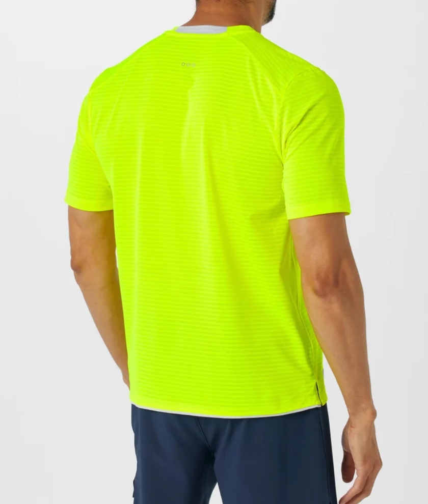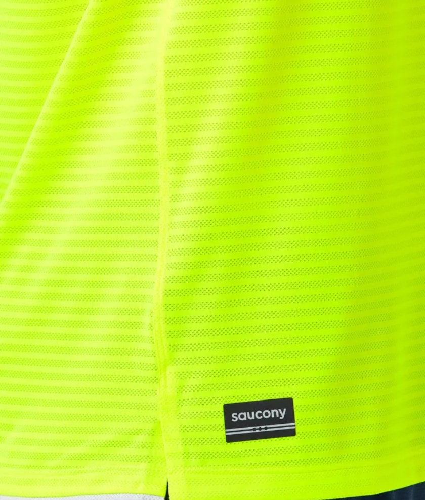 When training calls for a fast-paced day the Saucony Men's Kinvara Short Sleeve will be there to provide for all your speed needs. Made with polyester mesh fabric that is incredibly lightweight and breathable you're comfortable from the first step until the finish. This top dries fast and won't cling to your sweat as you train in the summer sun. Small details in the seaming such as backward rolled shoulder seams reduce chafing for the ultimate run.