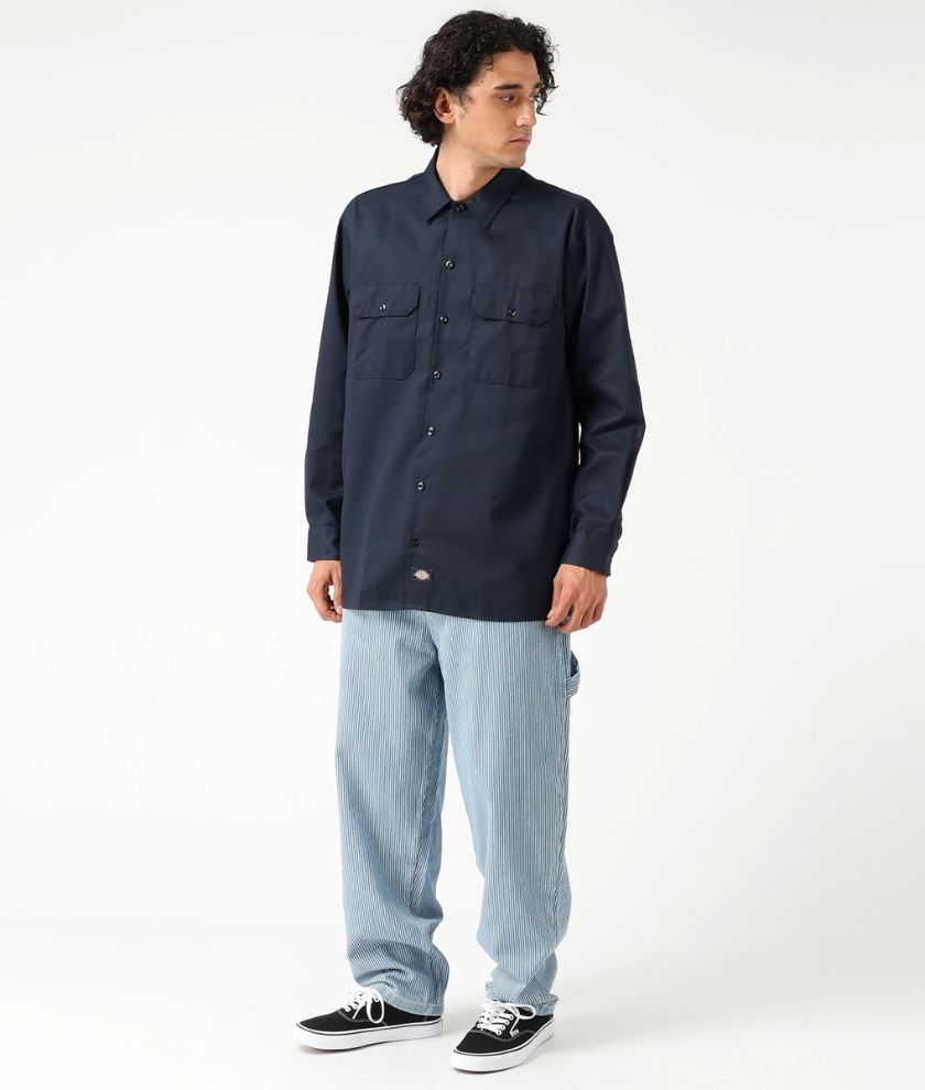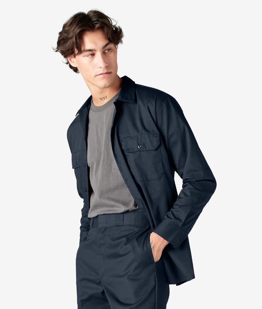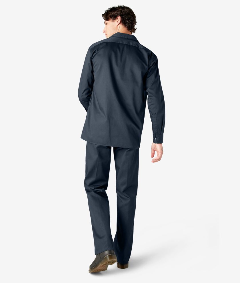 The Dickies Men's Long Sleeve Work Shirt is one of our classic designs, providing both comfort and style. Made to last, this dependable work shirt, made of durable fabric, has a functional build and non-break melamine buttons. This iconic design features a generous cut through the shoulders and chest that provides freedom of movement. Advanced moisture-wicking technology and an easy-care stain release finish makes this work shirt perfect for both the workplace and for fun after work. The shirt also has two functional chest pockets, including one with a pencil division, doghouse sleeve plackets, and a woven Dickies logo label.