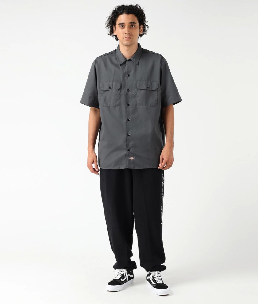 This short-sleeved work shirt is made of 5.25 oz mechanical stretch twill polyester cotton with a firm texture, and is both functional and durable. The flap pockets on both sides of the chest add a casual accent. It is smooth and light to the touch, and comfortable to wear. The loose silhouette allows you to style it without worrying. It can also be used as a jacket by opening the buttons. The design features a square tail that is designed to be long so that it can be worn with or without tucks. It is highly moisture-wicking and wrinkle-resistant, and you can enjoy styling like a set by combining the work shirt with the original 874 work pants.