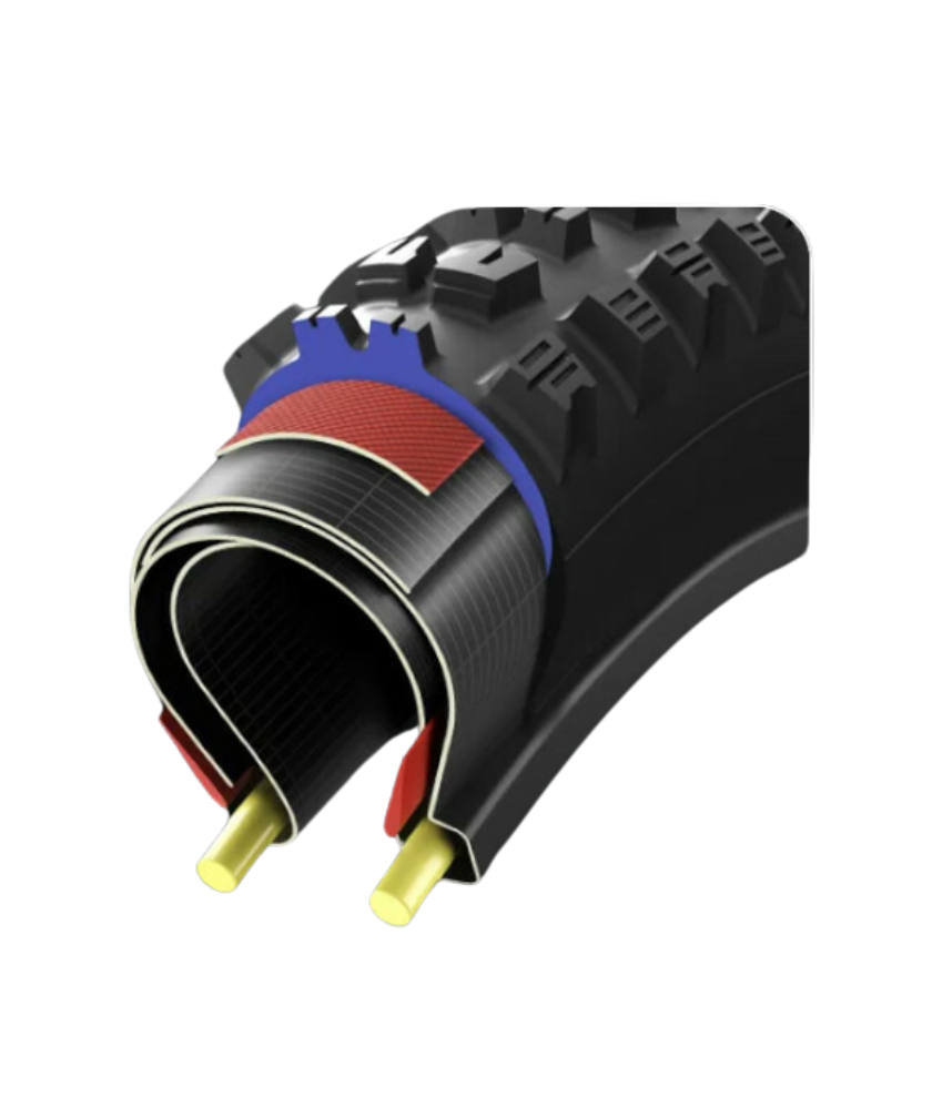 The muddiest downhill courses led to the development of the Mota tire. With widely offset Moto-Block lugs that dig deep into soft terrain, you have grip even on the greasy surfaces. Thanks to the profile, fine and controlled steering on the outer edge is possible. So you can drive safely through the hairpin bend even at the limit. The proven TLR carcass and APF (anti-pinch-flat) sidewall protection make the tire very robust. The optimized enduro race carcass maximizes driving experience and performance for technical trails at maximum speed. An insert below the tread protects against punctures.